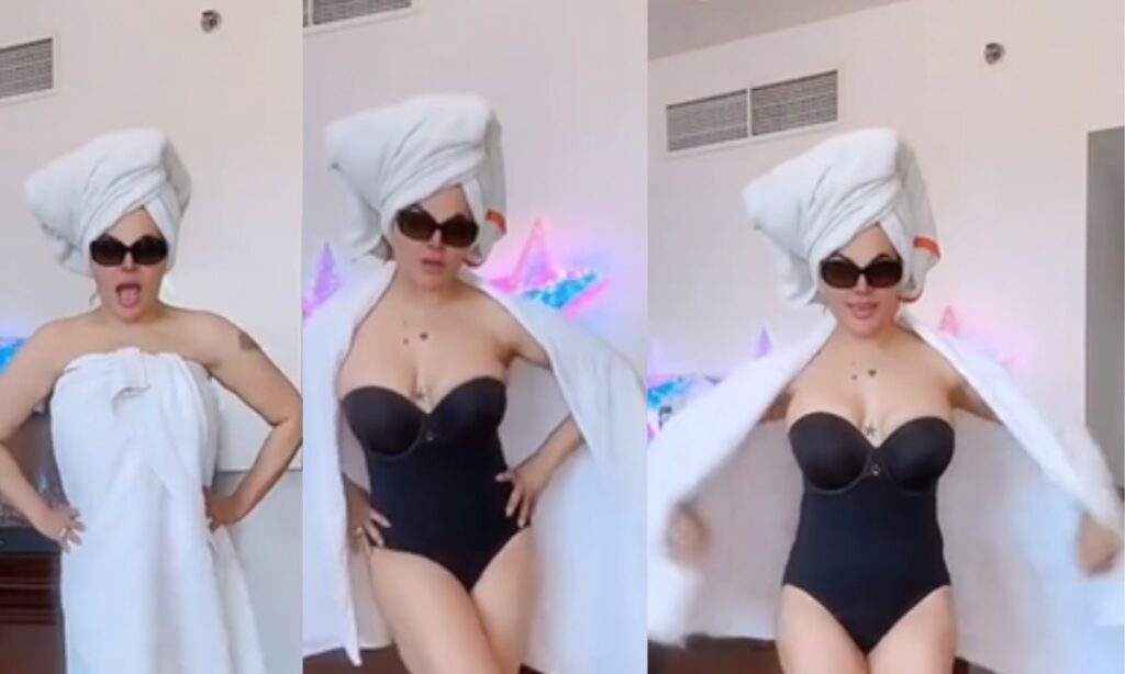 In the video ,she removes and hides her towel while saying, ‘Oops, Oops…’ and then dazzles in her black monokini.